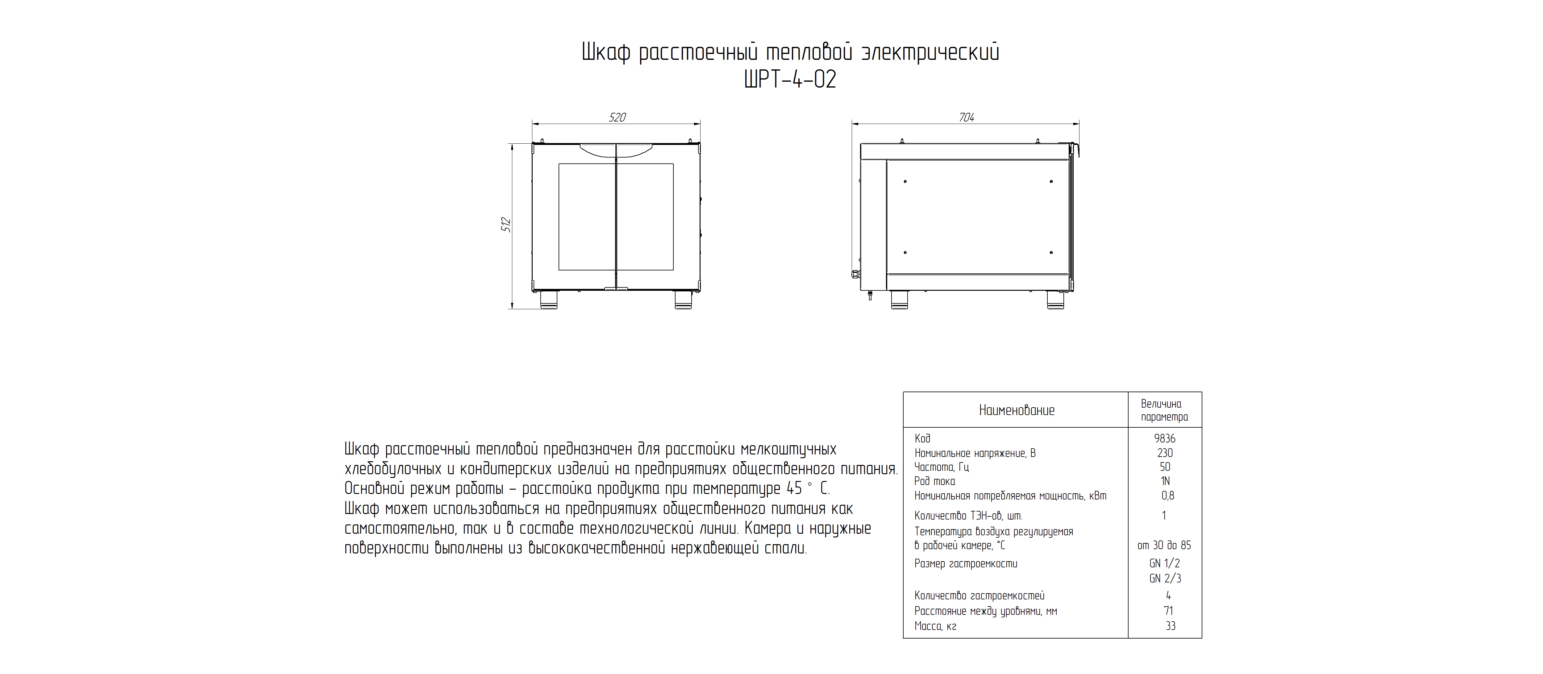 Расстоечный шкаф Abat ШРТ-4-02 используется в пекарнях, кондитерских и на предприятиях общественного питания и торговли для расстойки тестовых заготовок, в процессе которой тесто увеличивается в объеме и приобретает ровную поверхность, восстанавливается его пористость. Модель оснащена лотком для сбора конденсата и регулируемыми по высоте ножками.
